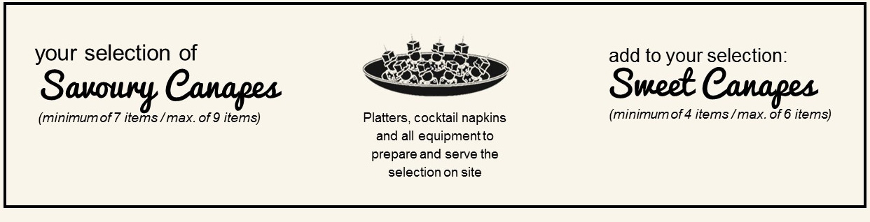 → Choose your savoury canapes selection – minimum of 7 items (included in the package) and maximum of 9 items (additional cost)